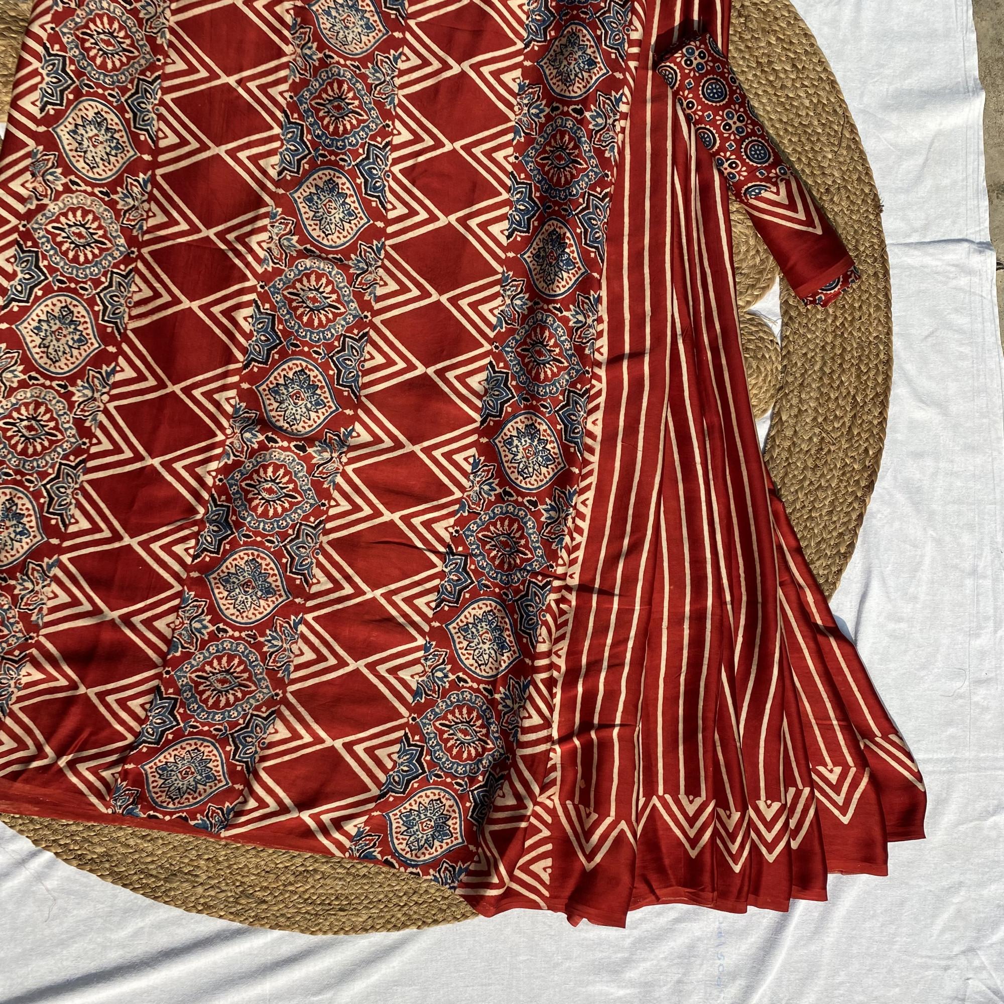 Expertly handcrafted by artisans using the ancient Ajrakh block printing technique, this saree features geometric and floral motifs that celebrate traditional artistry. Made from premium modal fabric , it offers a soft, fluid drape and a subtle sheen, perfect for both festive and casual occasions. The saree’s striped pallu design adds a modern edge, while the included blouse piece carries coordinated Ajrakh motifs for a complete, cohesive look.