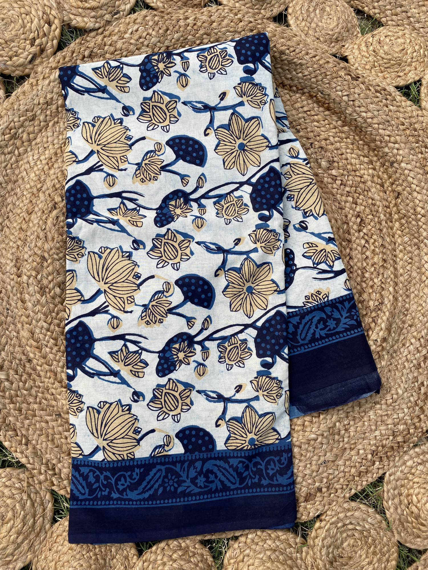 White Floral cotton mulmul hand block print sari Comes with its own RUNNING blouse (90 CM) .